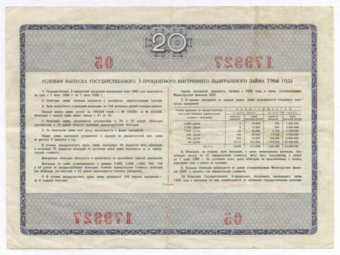 Облигация 20 рублей 1966 год. Серия № 179927. F-VF
