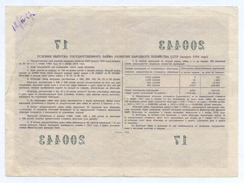 Облигация 25 рублей 1956 год. Серия № 200443. VG (надпись)