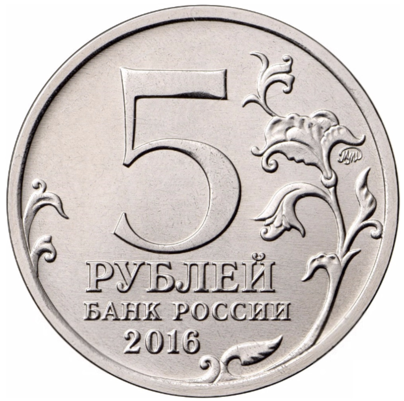 Аверс: В центре расположено обозначение номинала монеты в две строки - «5 Рублей», ниже – надпись «Банк России», под ней дата — «2016», слева и справа — стилизованная ветка растения, в правой части монеты — товарный знак монетного двора.