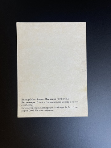 Открытка Богоматерь Роспись Владимирского Собора в Киеве, В.М.Васнецов, 14.7х11.5 см, Киров. 2002 год. Частное собрание. Присутствуют незначительные следы использования, состояние на фото