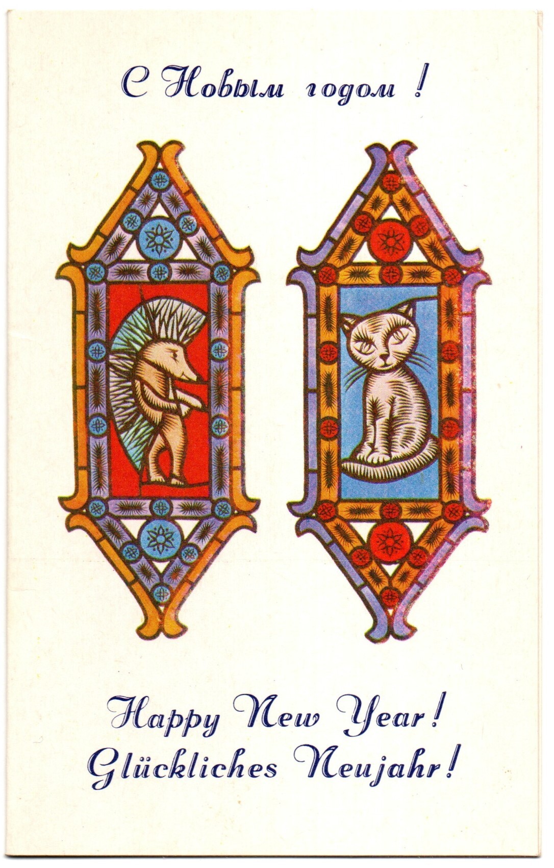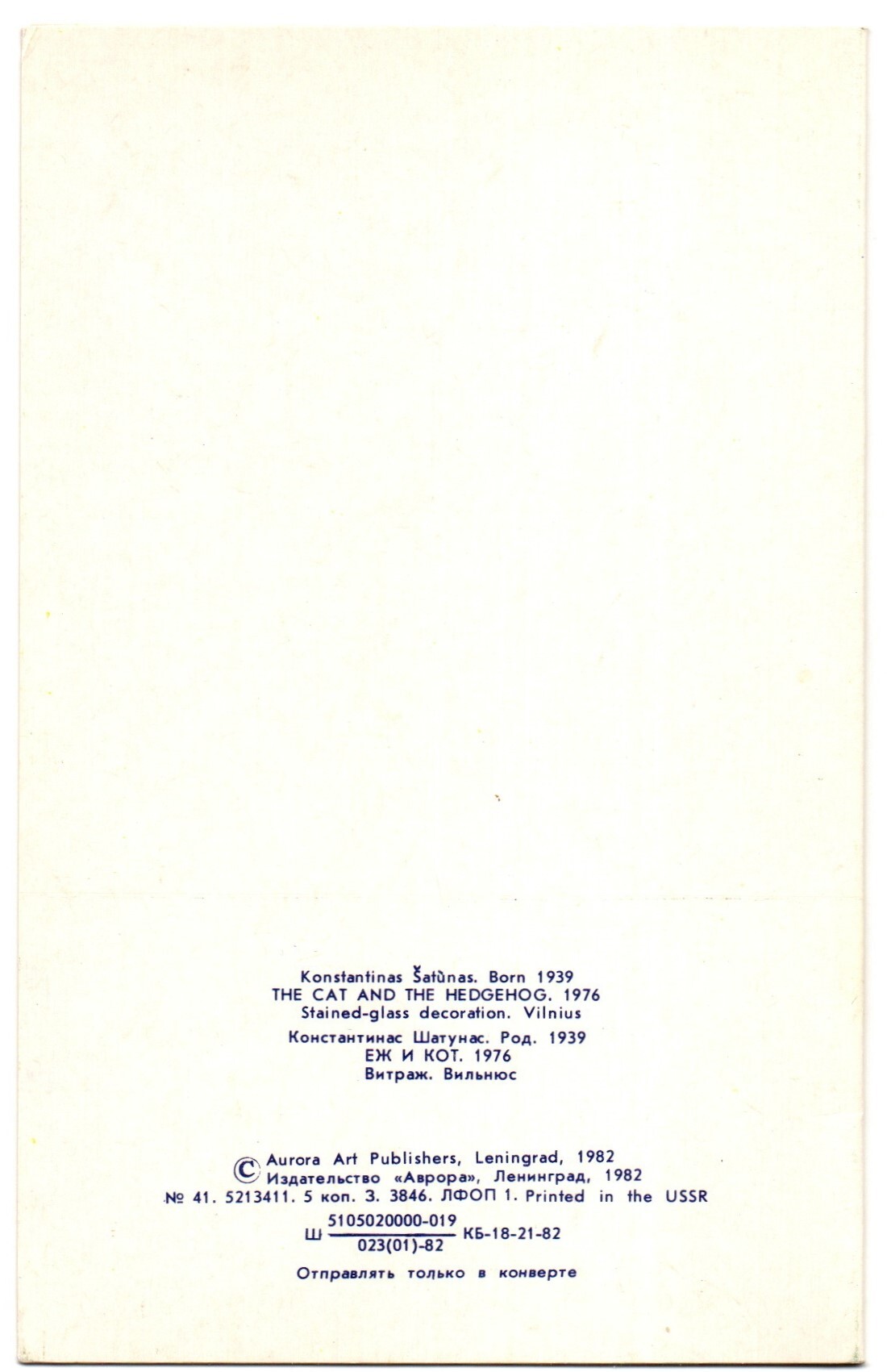 Открытка новогодняя двойная чистая "Еж и кот", Константинас Шатунас, винтаж 1976 год, витраж Вильнюс