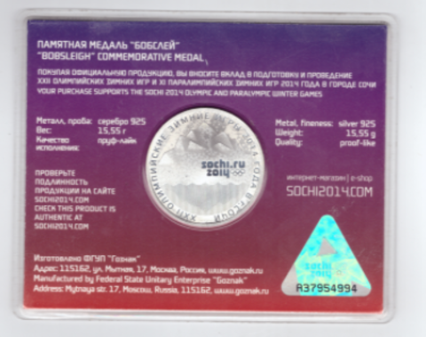 Памятная медаль "Бобслей" Сочи 2014 официальная лицензионная продукция с голограммой
