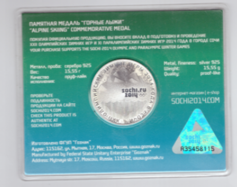Памятная медаль "Горные лыжи" Сочи 2014 официальная лицензионная продукция с голограммой