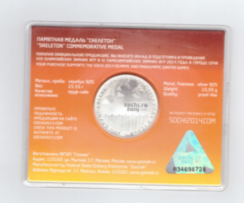 Памятная медаль "Скелетон" Сочи 2014 официальная лицензионная продукция с голограммой
