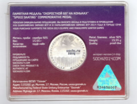 Памятная медаль "Скоростной бег на коньках" Сочи 2014 официальная лицензионная продукция с голограммой