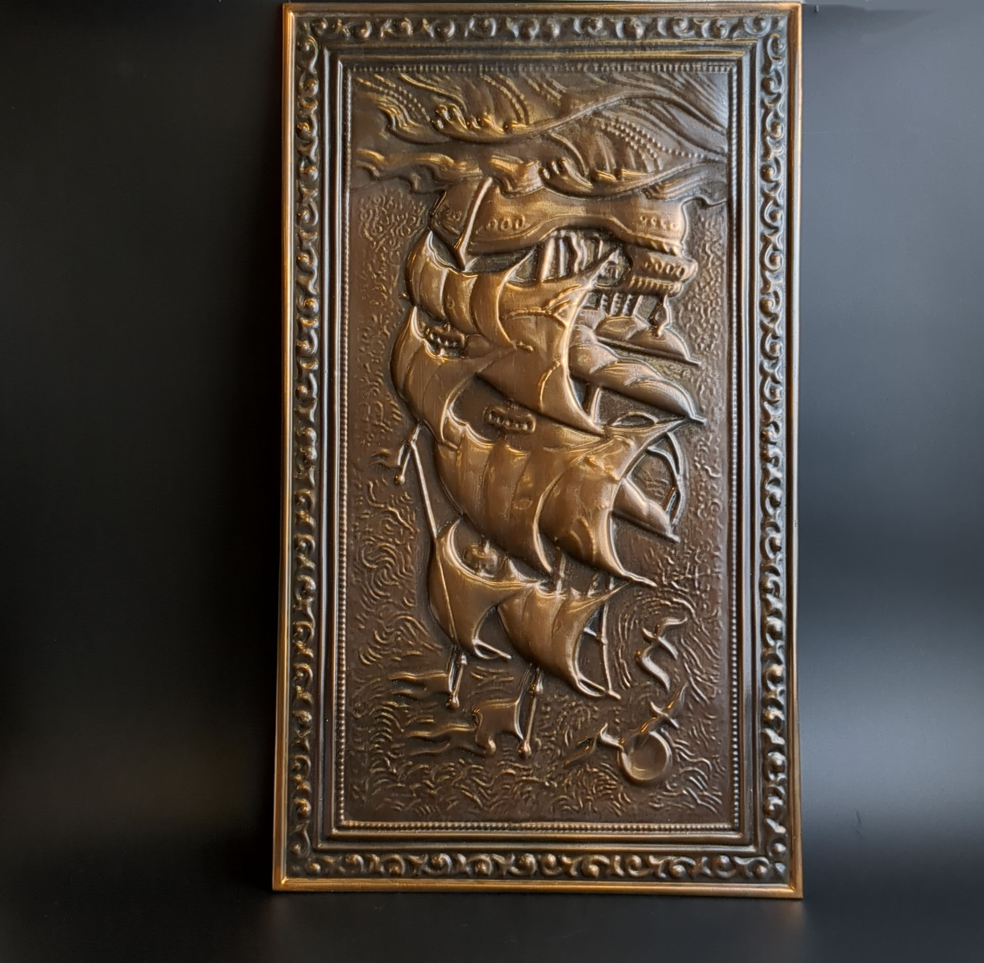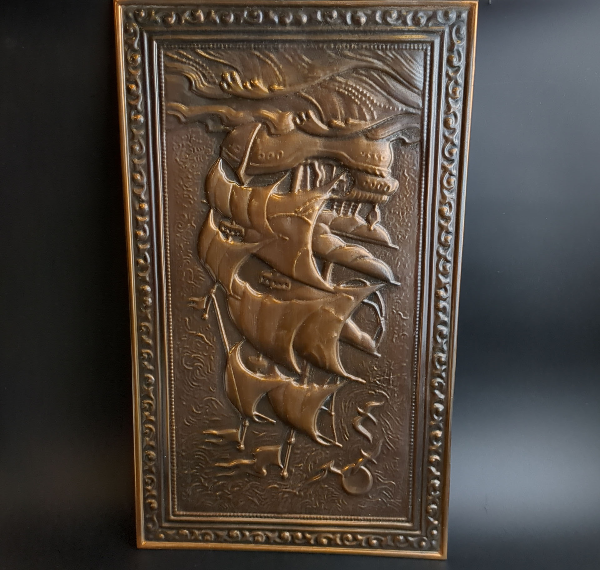 Панно настенное Алые паруса / корабль парусник. металл, медная чеканка, Запорожский титано-магниевый комбинат. СССР, 1975-1990 гг. Высота 46 см. ширина 27 см. Присутствуют следы использования. Состояние на фото