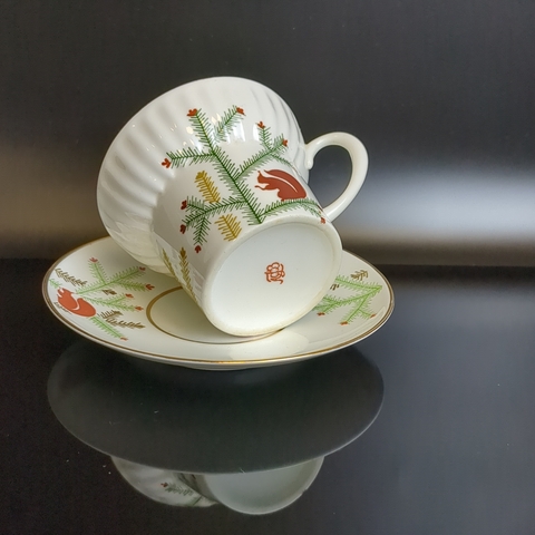 Пара кофейная костяной фарфор "Белочка на ветке" форма "волна", клеймо ЛФЗ (Ленинградский Фарфоровый Завод), автор росписи Н.Славина, скульптор Э.М.Криммер, винтаж СССР 1970-1991 гг.