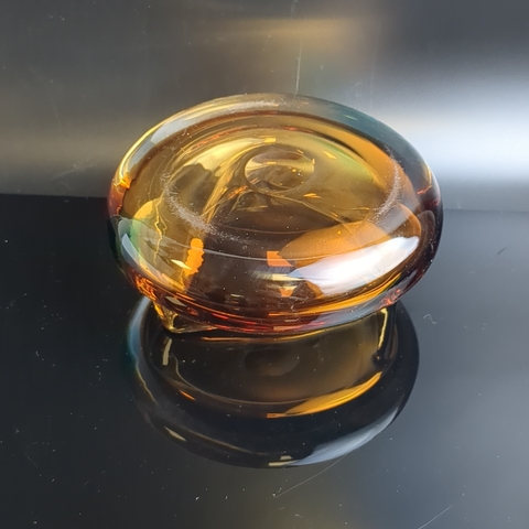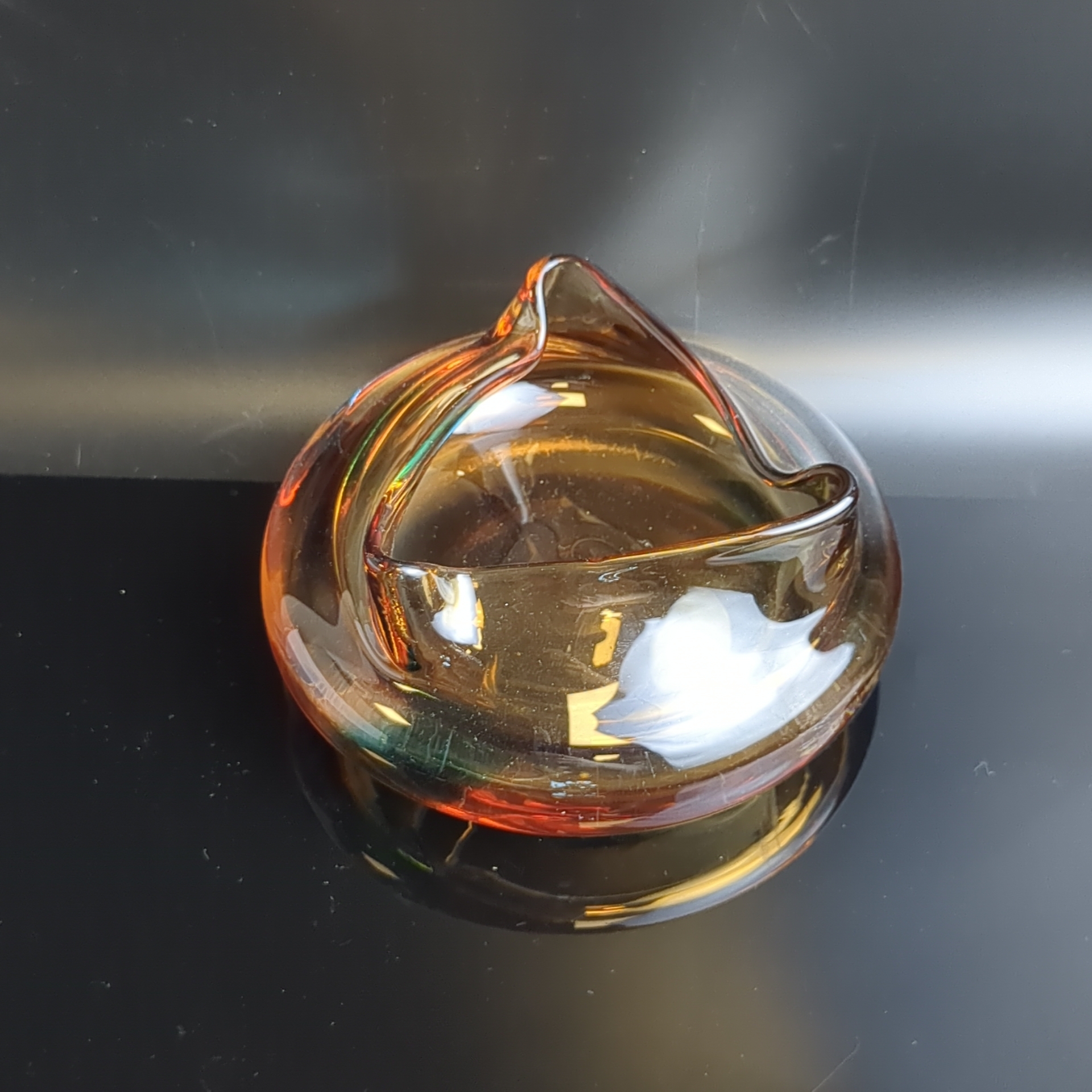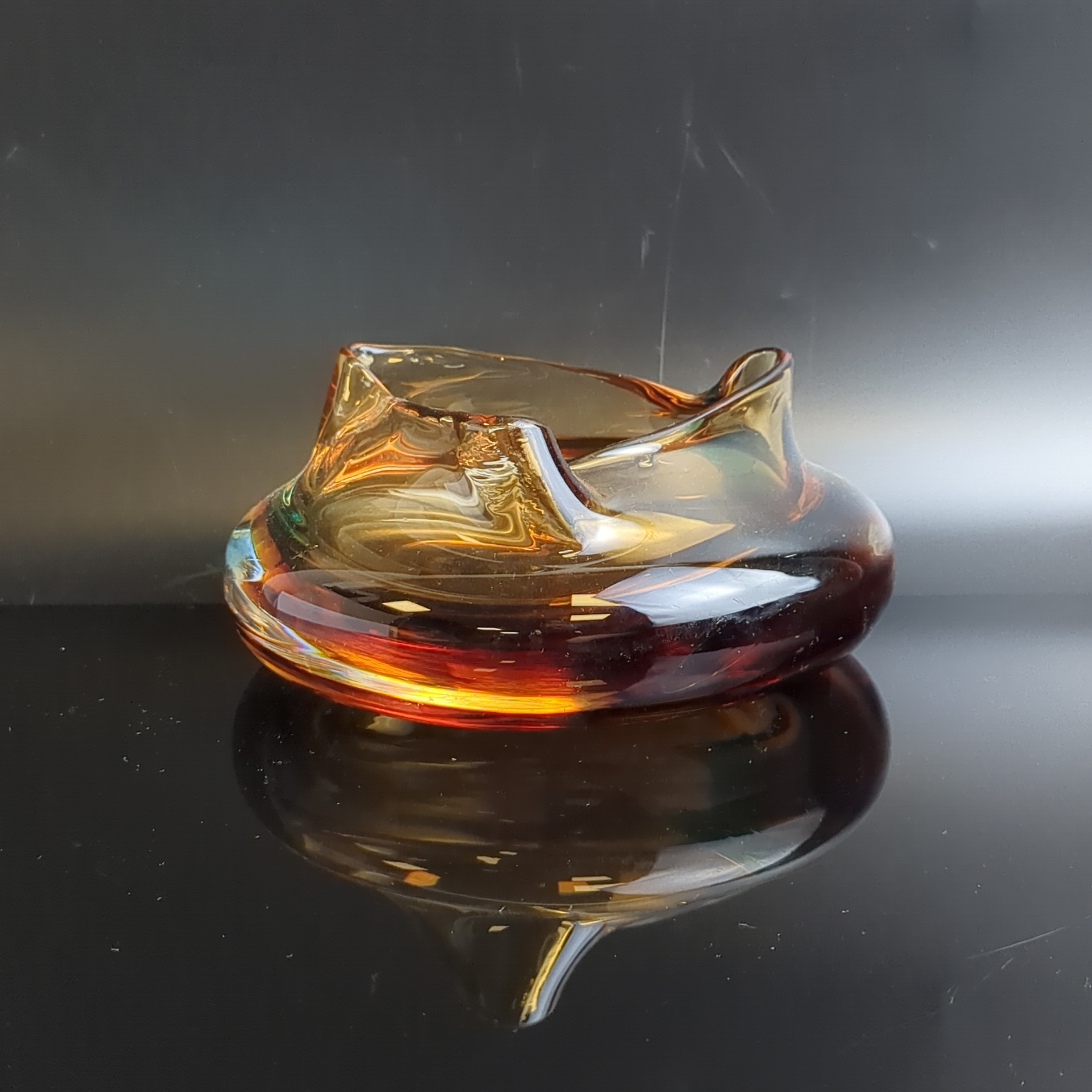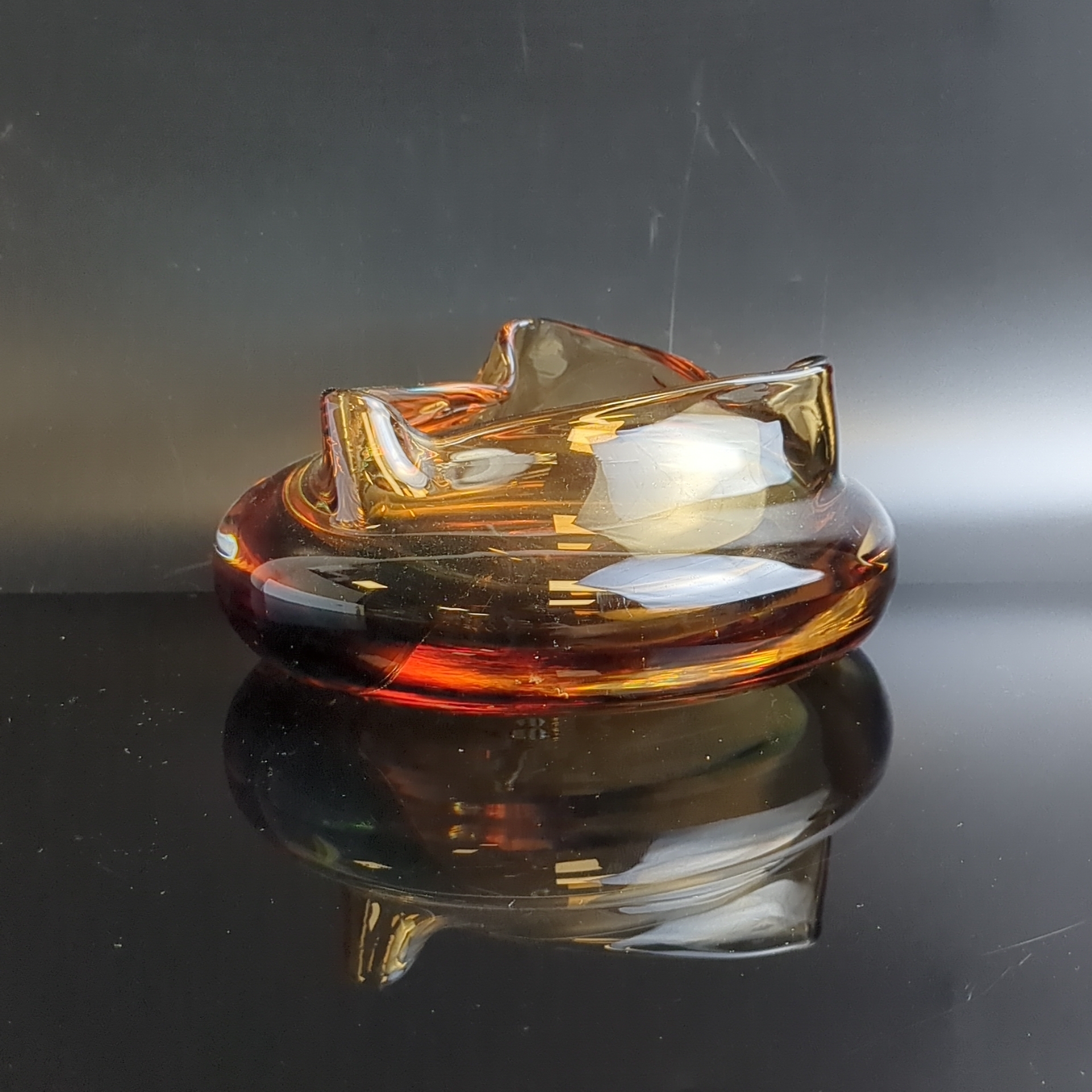 Пепельница антуражная необычной формы в янтарно-зелёной гамме, цветное стекло, гутная техника, Чехословакия винтаж времён СССР 1970-1990 гг. Высота - 7.5 см.
