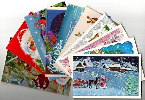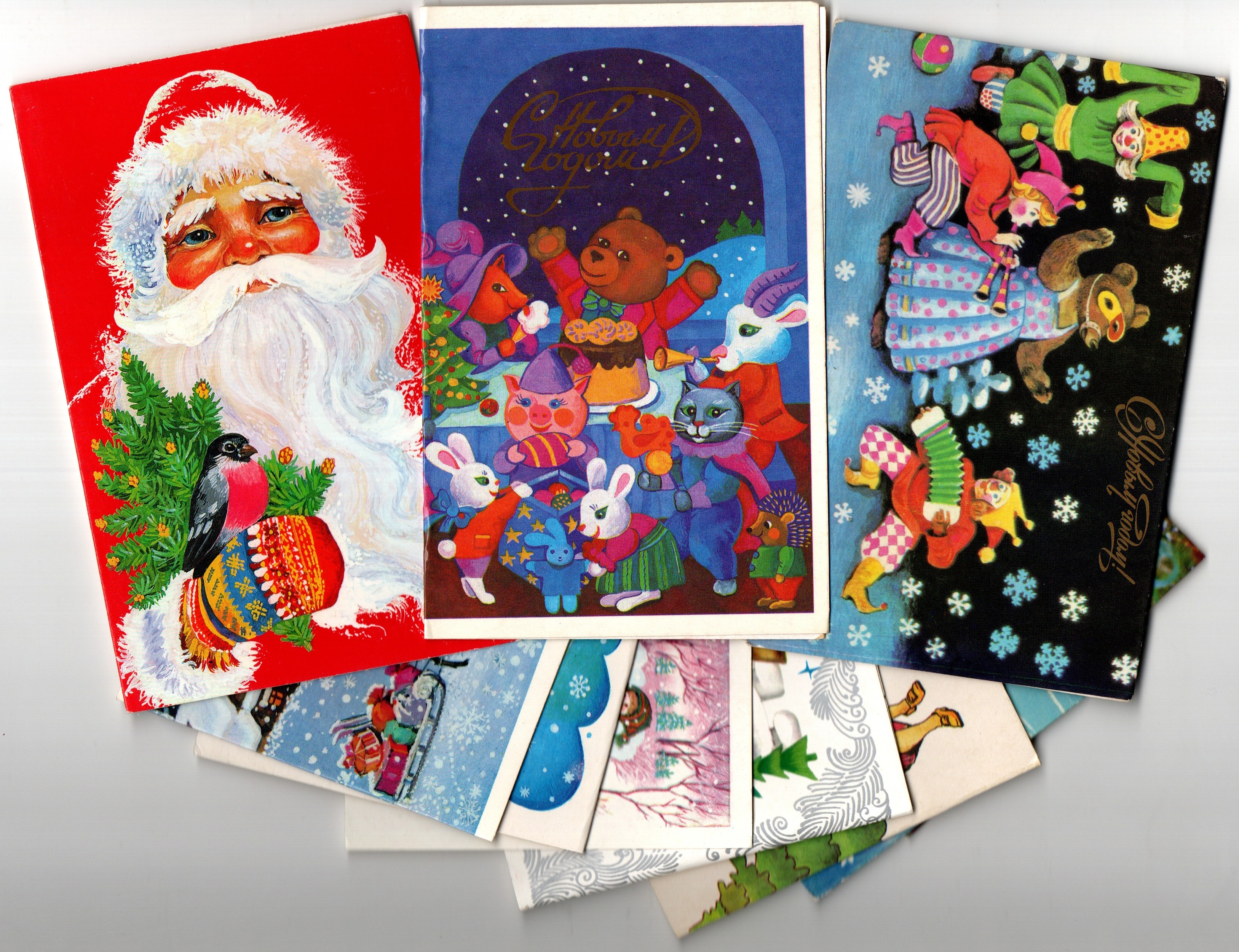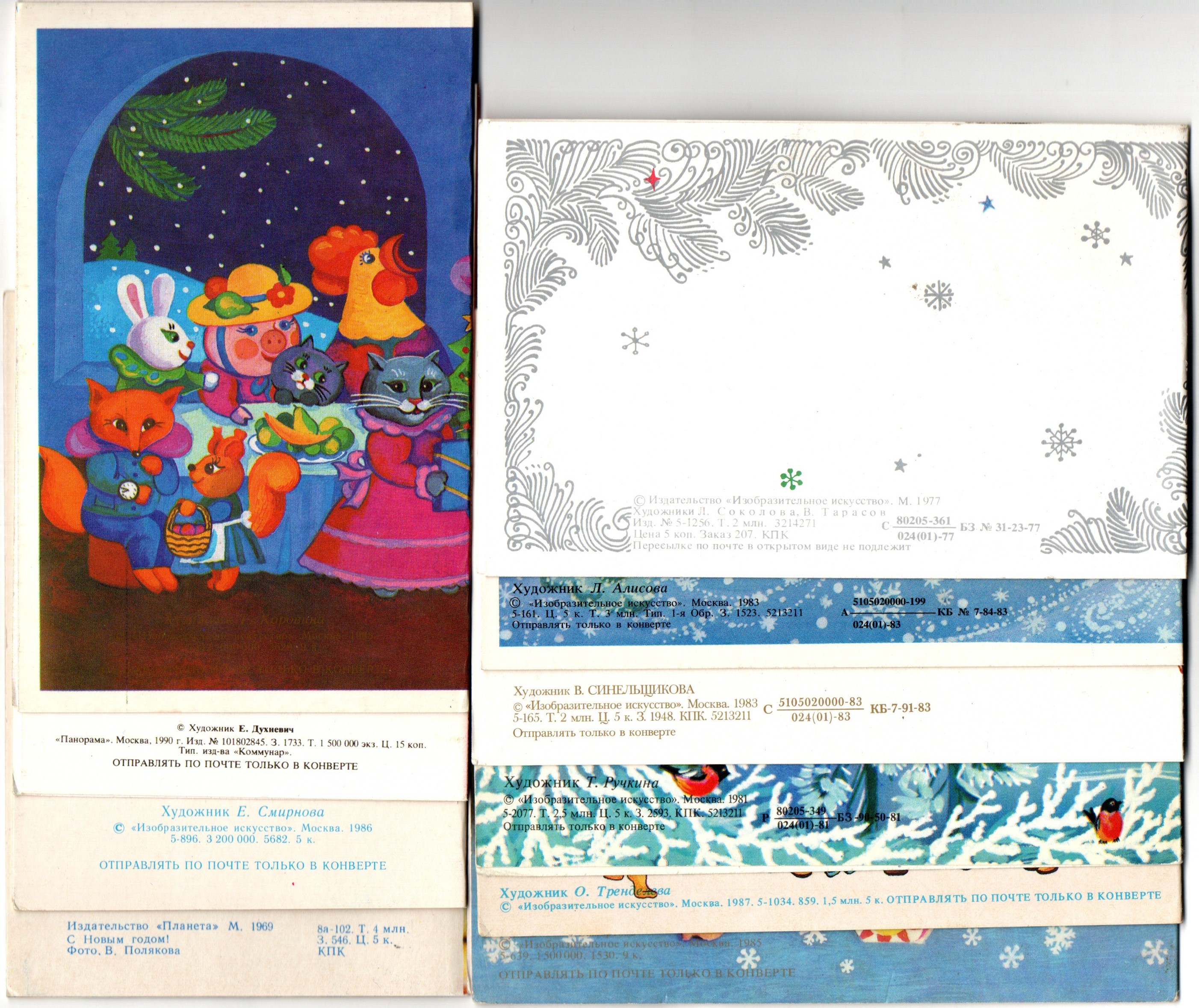 Оригинальная подборка двойных раритетных Новогодних поздравительных открыток — 10 штук — разные художники : Духневич, Алисова, Тренделева, Синельщикова, Полякова, Ручкина, Смирнова, Коровина, Саморезов, Соколова — чистые, без повторов, времён СССР. Каждая открытка эксклюзивна и создана талантливыми художниками Советского Союза. Старинные открытки имеют неповторимый стиль СССР и набирают все больше и больше популярности среди коллекционеров.