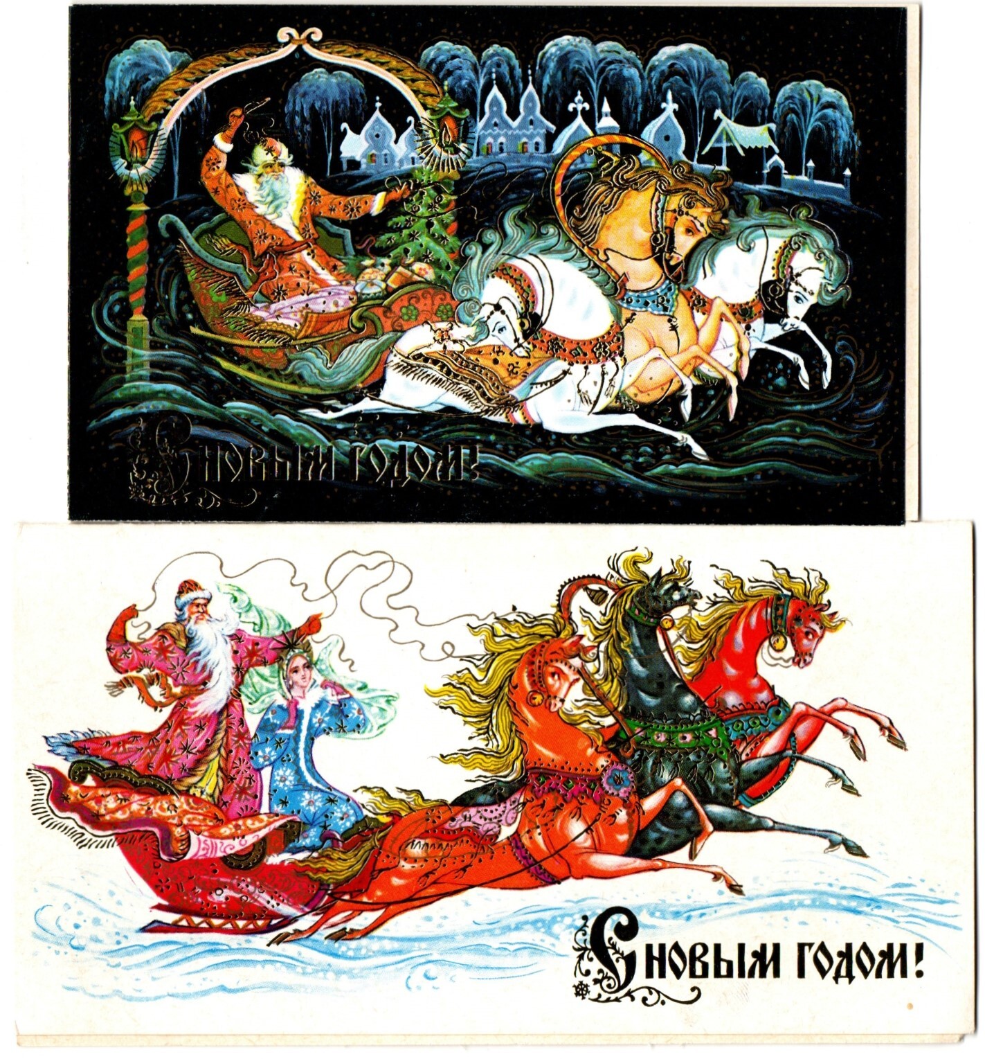 Подборка из 2х штук двойных поздравительных открыток художник К. Андрианов — чистые. Винтажные новогодние открытки времён СССР в стиле Палех это отличный выбор для создания новогоднего настроения! От художника К. Андрианова под любое настроение! Искусство от автора Палех, оригинал. Его произведения хранятся в собраниях Государственного музея Палехского искусства, Государственного русского музея и др.Яркие и интересные сюжеты. Без повторений – каждая открытка эксклюзивна! Отлично подойдет в личную коллекцию и на подарок коллекционерам открыток.