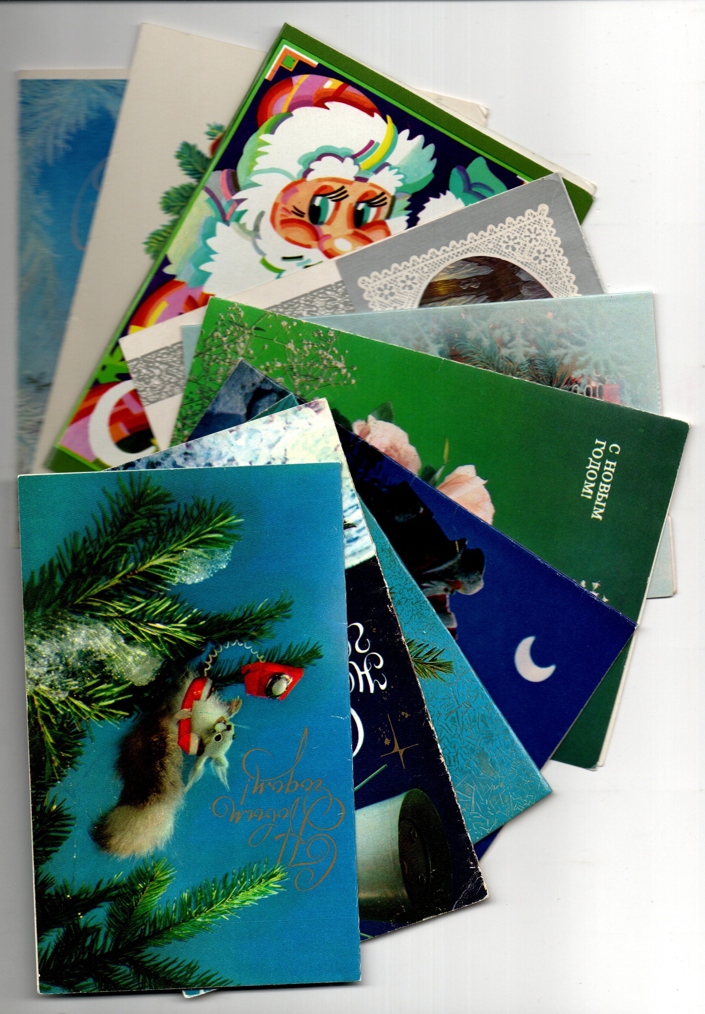 Подборка поздравительных двойных новогодних открыток — 10 штук— разные художники, — чистые, без повторов времен СССР