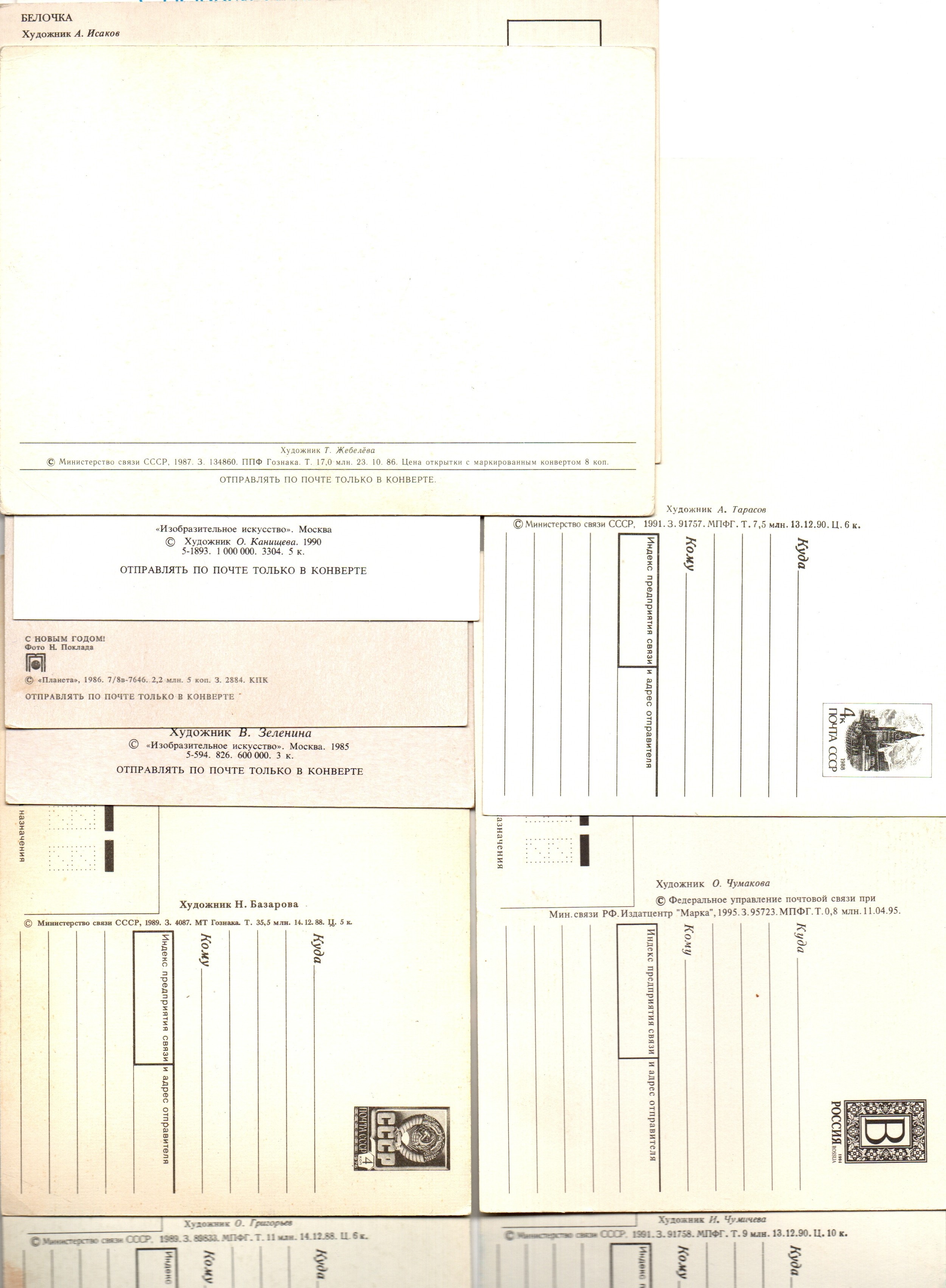 Оригинальная подборка раритетных Новогодних поздравительных открыток — 10 штук — разные художники Зеленина, Чумичева, Исаков, Поклада, Жебелева, Григорьев, Канищева, Базарова, Тарасов — чистые, без повторов, времён СССР 1960-1990 гг. Каждая открытка эксклюзивна и создана талантливыми художниками Советского Союза. Старинные открытки имеют неповторимый стиль СССР и набирают все больше и больше популярности среди коллекционеров. Советские открытки С Новым годом отлично подойдут в личную коллекцию и на подарок коллекционерам открыток. Состояние и комплектация на фото.