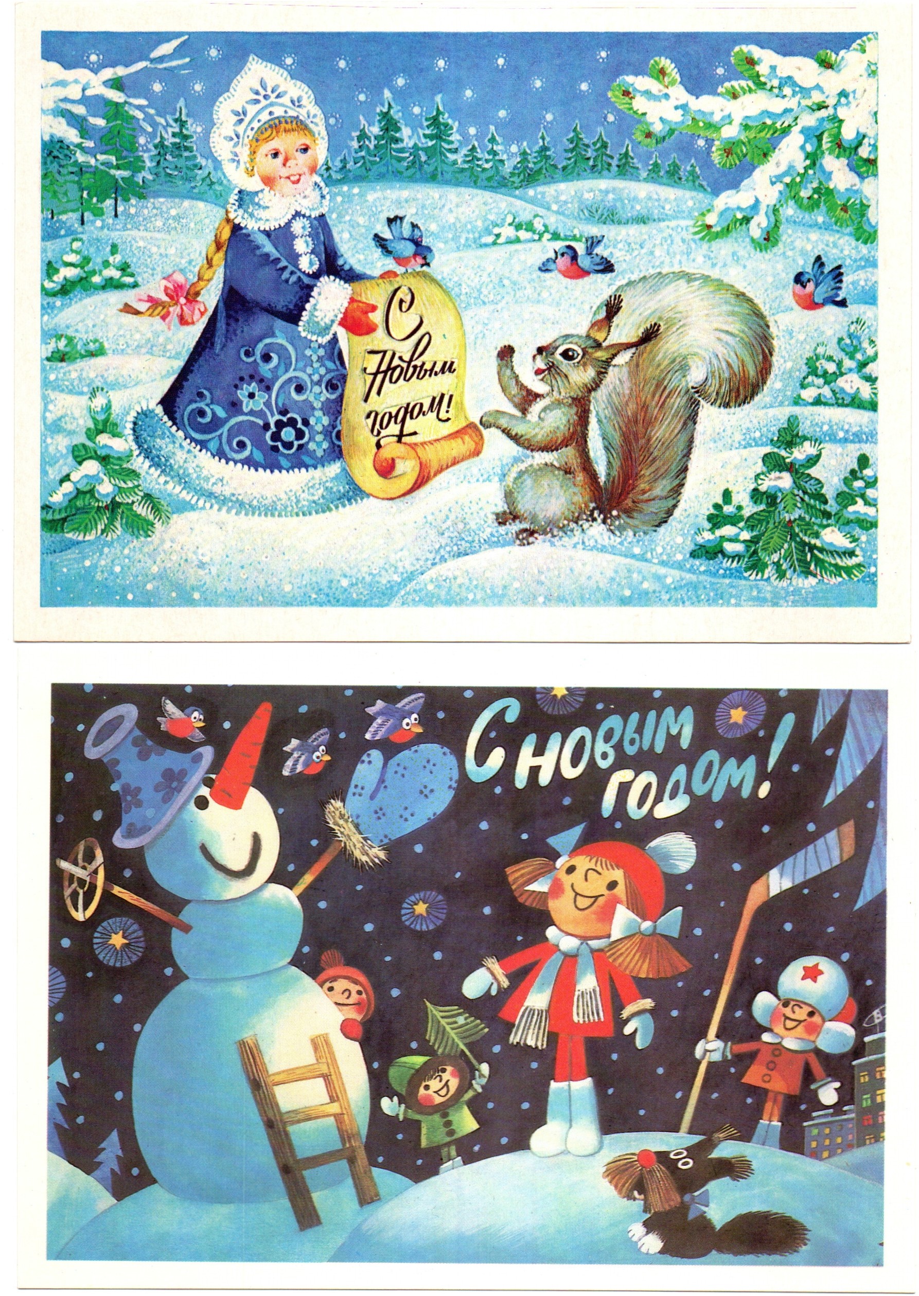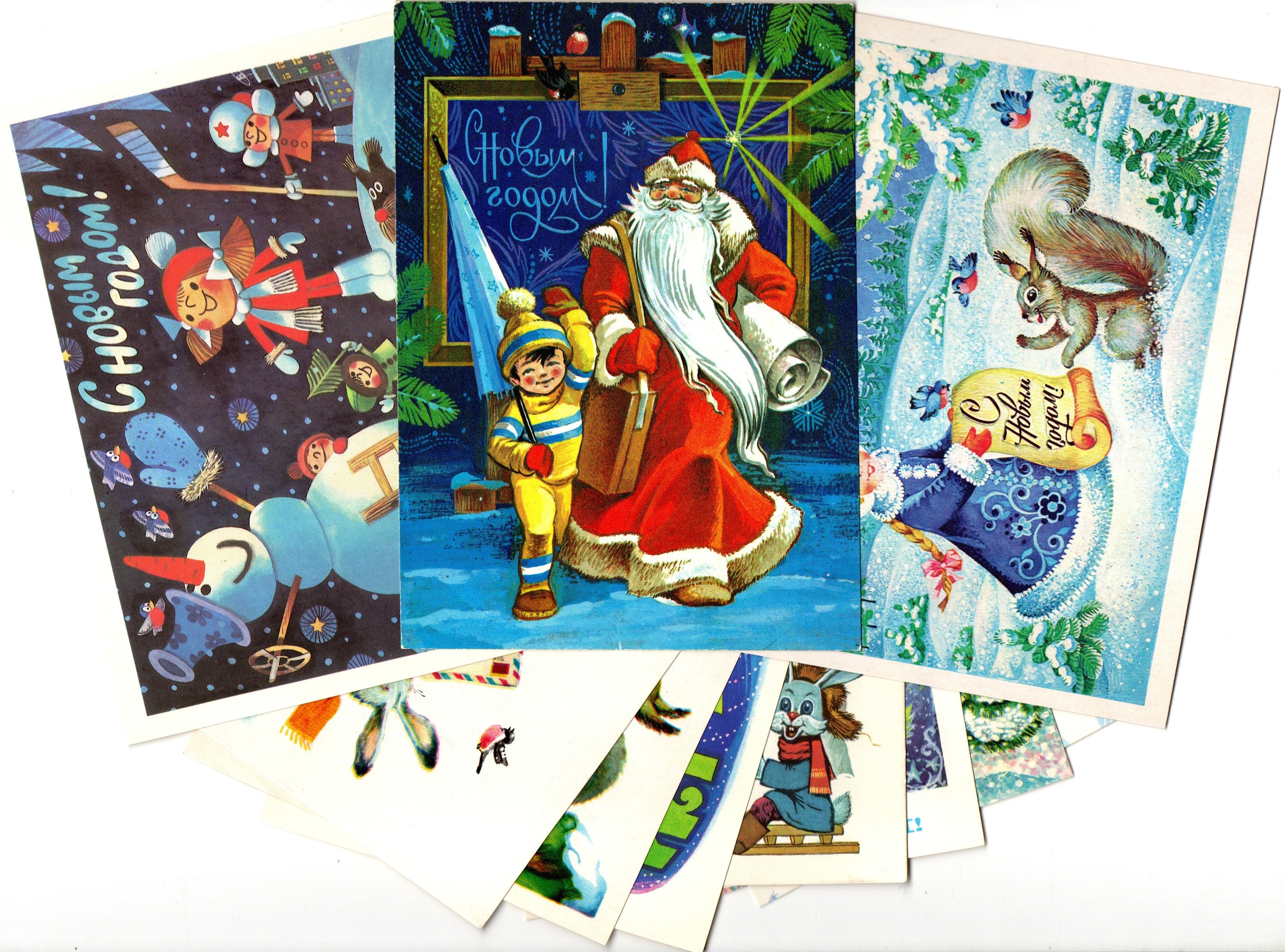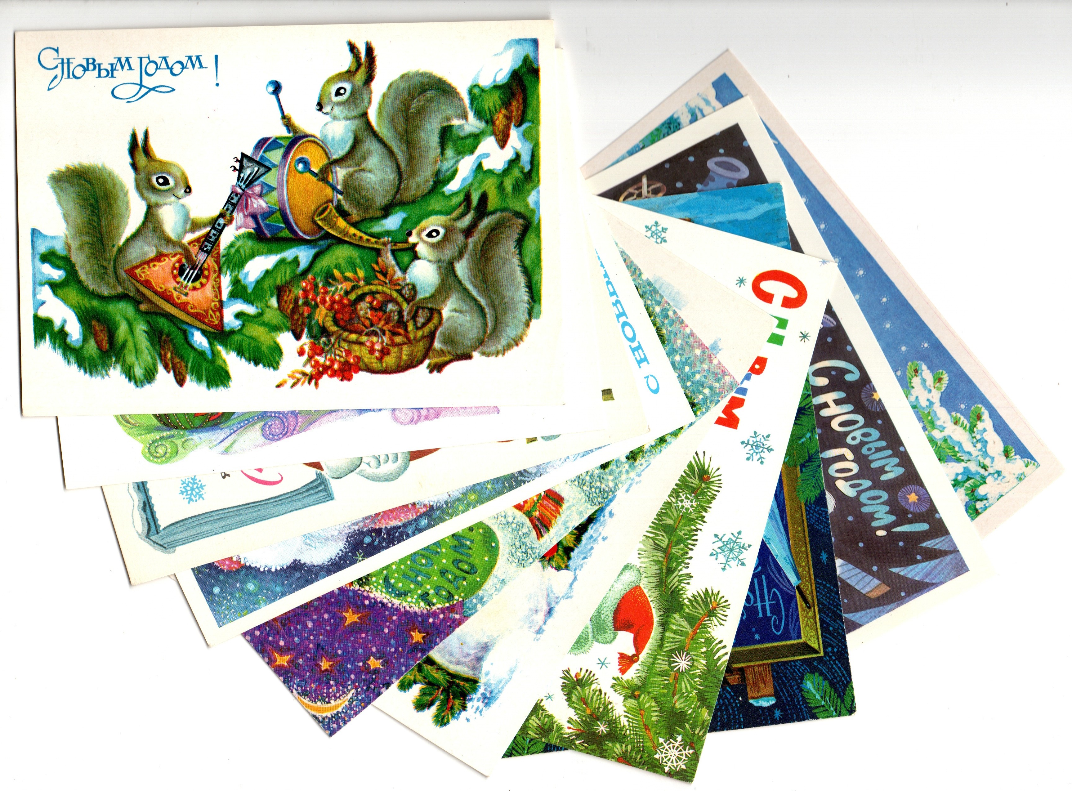 Подборка поздравительных Новогодних открыток — 10 штук— разные художники —чистые, без повторов, винтаж времен СССР