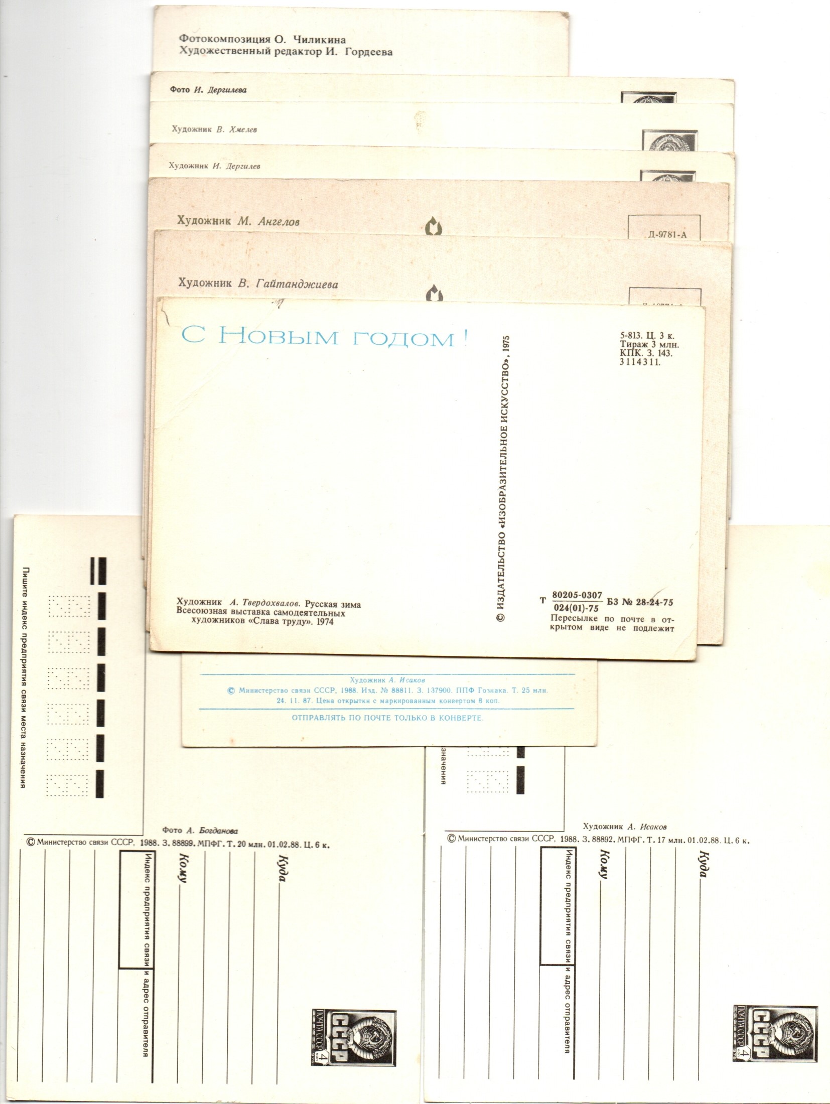 Подборка поздравительных открыток — 10 штук— разные художники— чистые, без повторов. Винтажные новогодние открытки времён СССР это отличный выбор для создания новогоднего настроения! Уникальная подборка из 10 праздничных открыток от разных советских художников под любое настроение! Без повторений – каждая открытка эксклюзивна! Отлично подойдет в личную коллекцию и на подарок коллекционерам открыток.