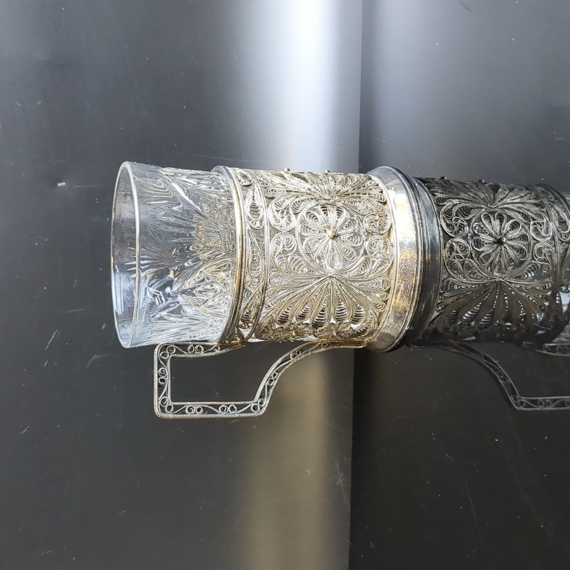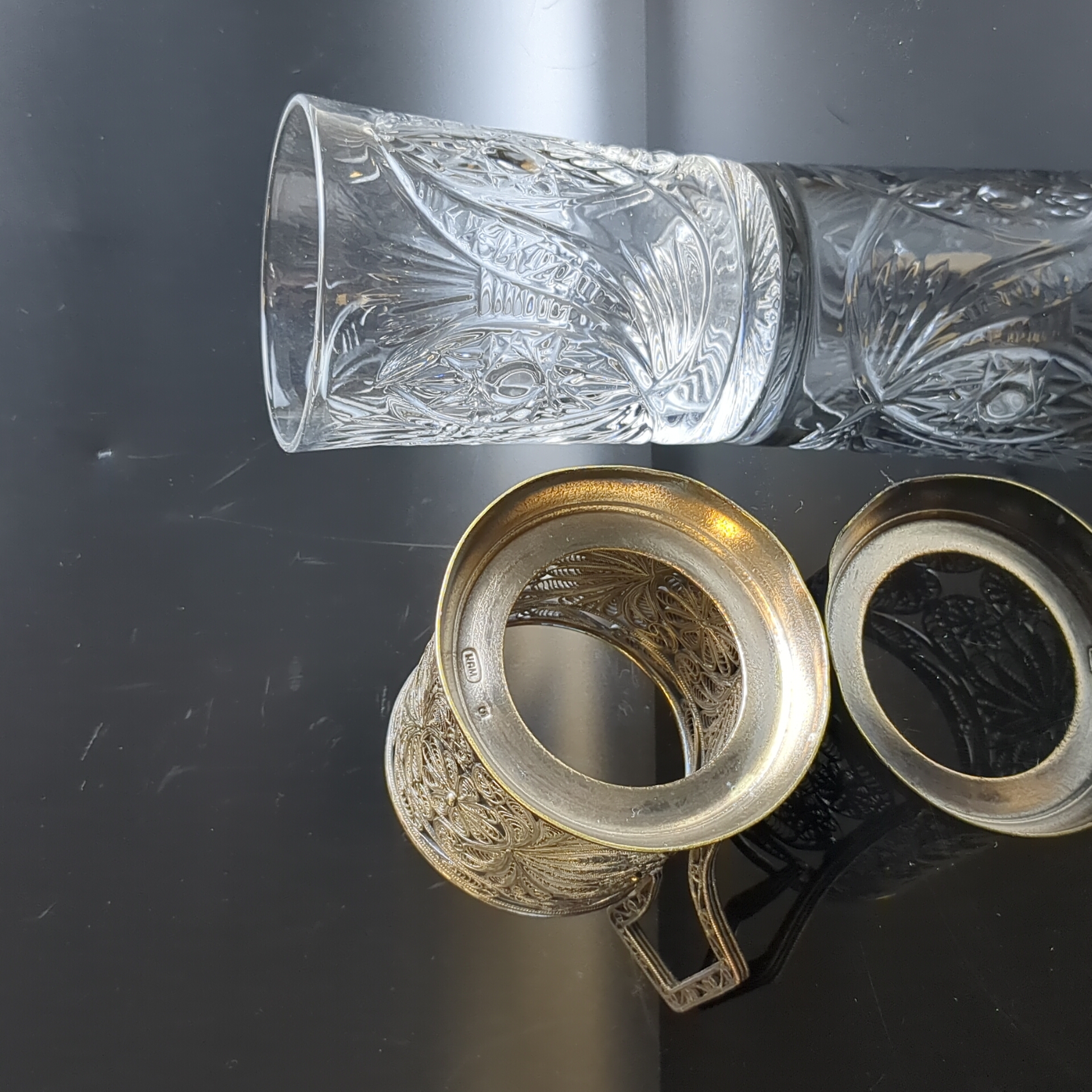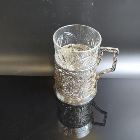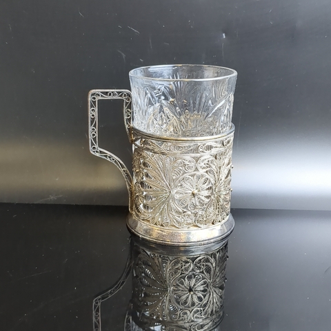 Подстаканник с хрустальным стаканом, выполненный в технике ажурной скани, металл, Казаковская артель «Металлист», СССР, 1950-1970 гг.