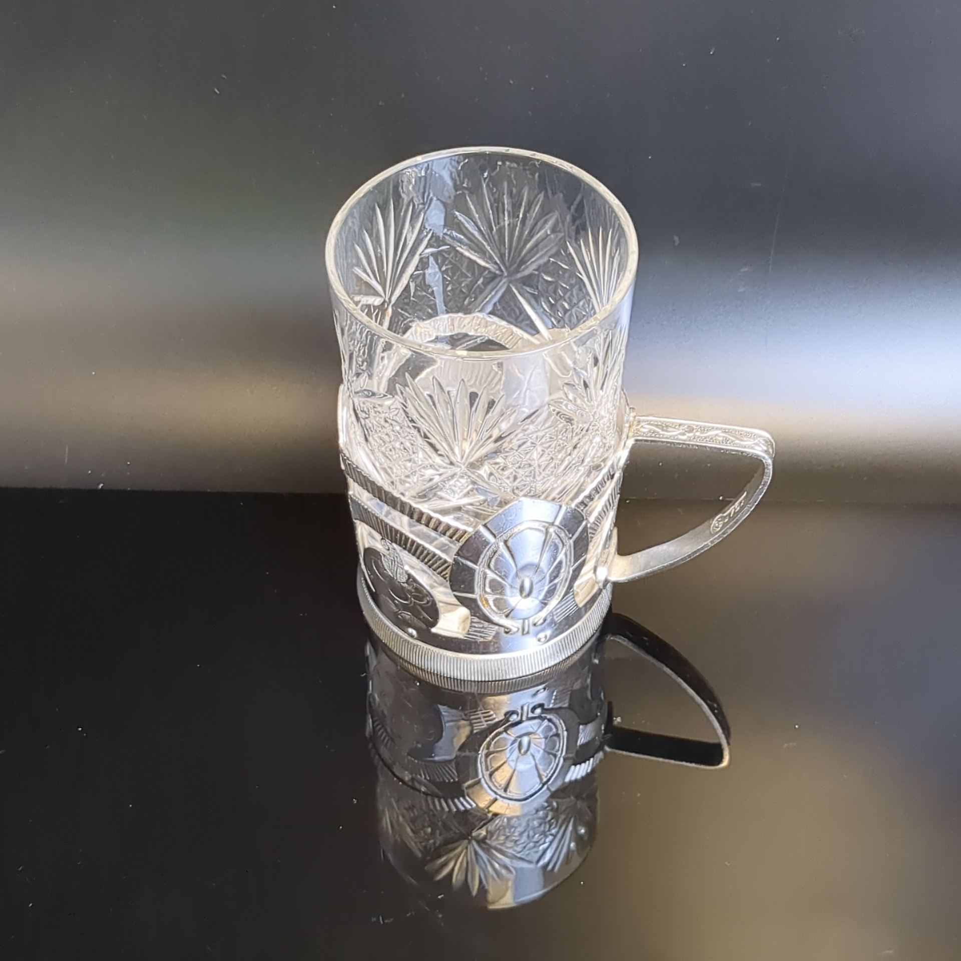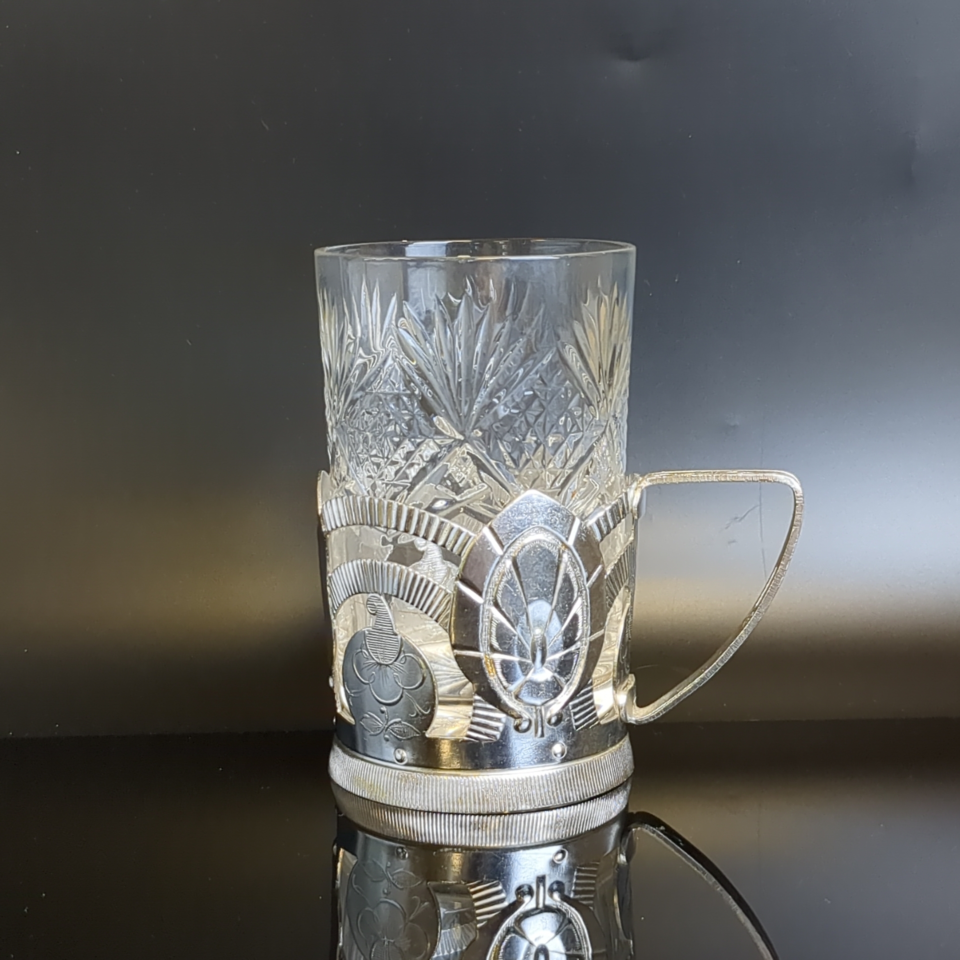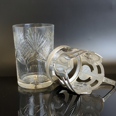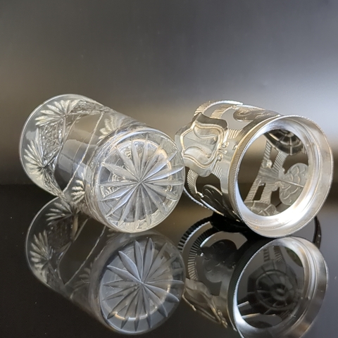 Подстаканник "Тюльпан" с хрустальным стаканом, каменный цветок, алюминий, Верх-Исетский завод, винтаж СССР. Состояние на фото