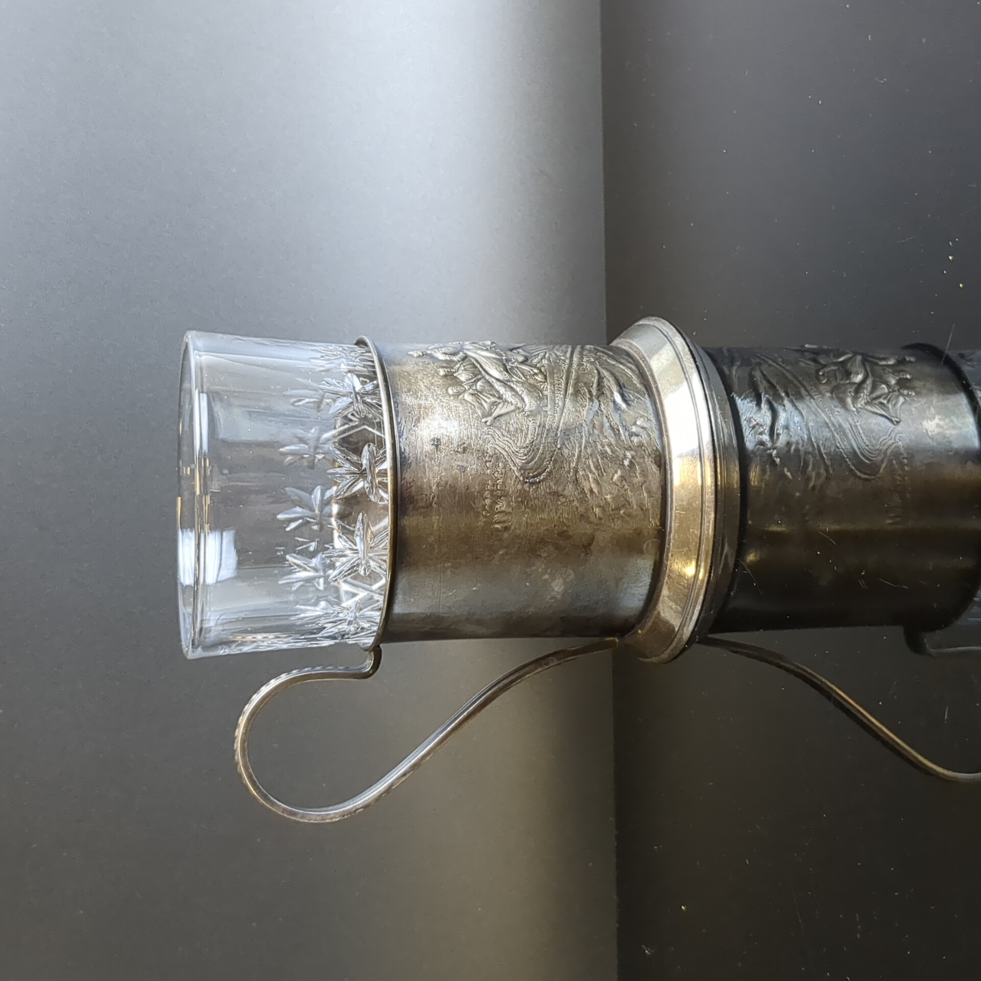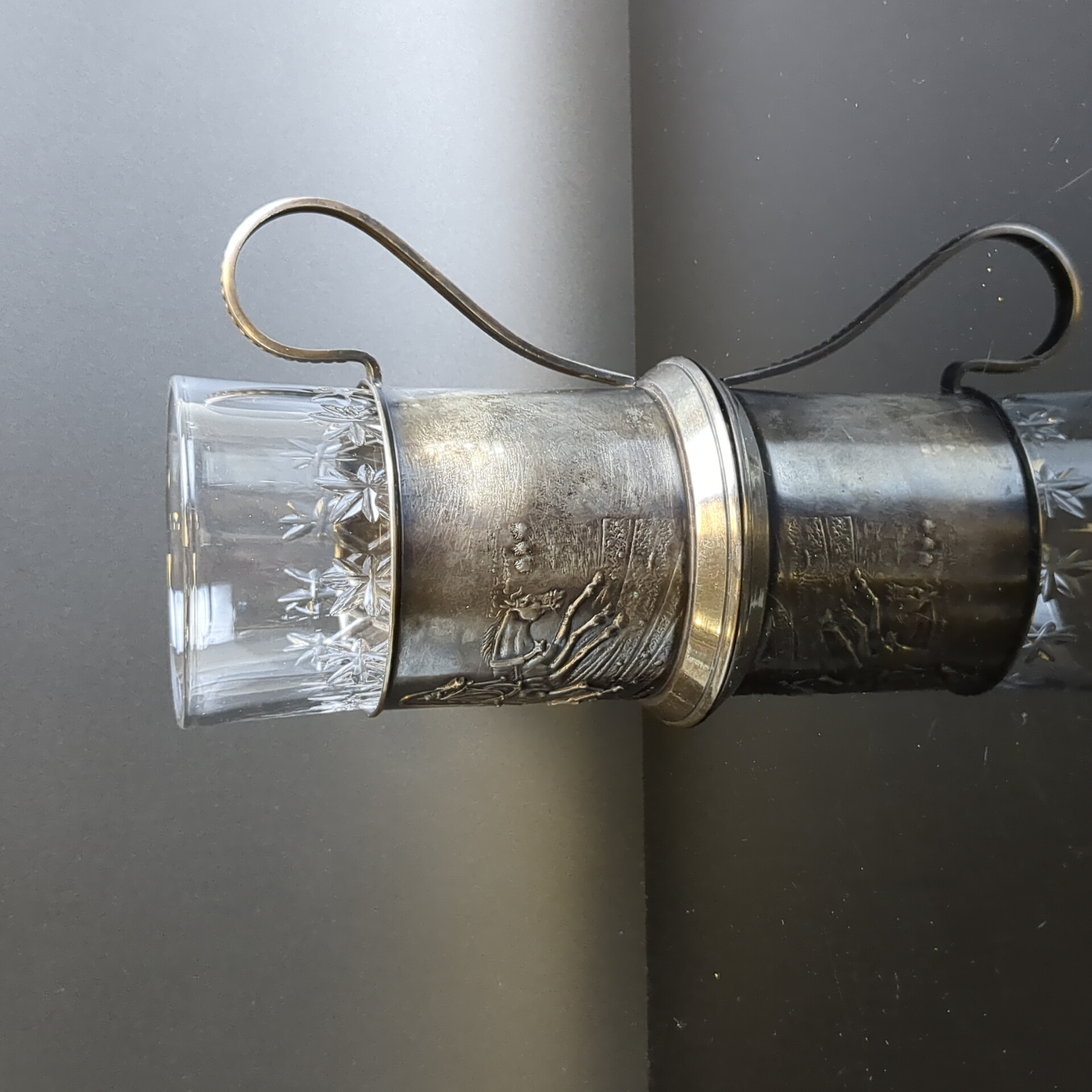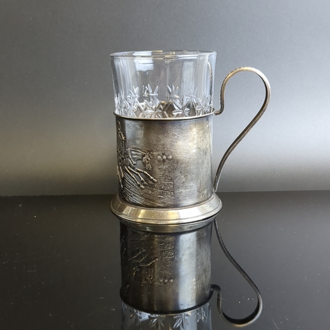 Подстаканник «Зимняя тройка» с хрустальным стаканом, мельхиор (медь-никель), Артель «Мстерский ювелир» им. В. М. Молотова, СССР, 1949-1952 гг.