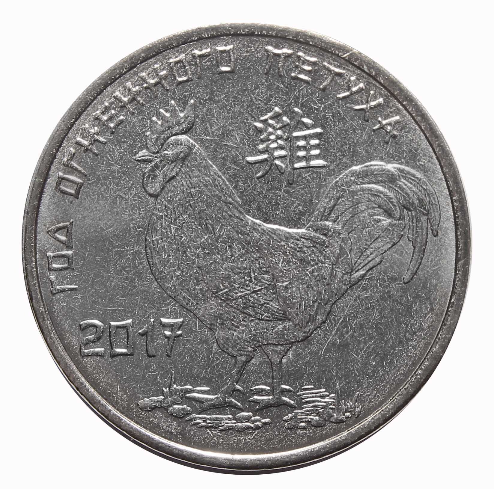 Реверс: в центре – стилизованное изображение петуха; выше – иероглиф, обозначающий символ 2017 года; слева надпись – «2017», вверху надпись – «ГОД ОГНЕННОГО ПЕТУХА».
