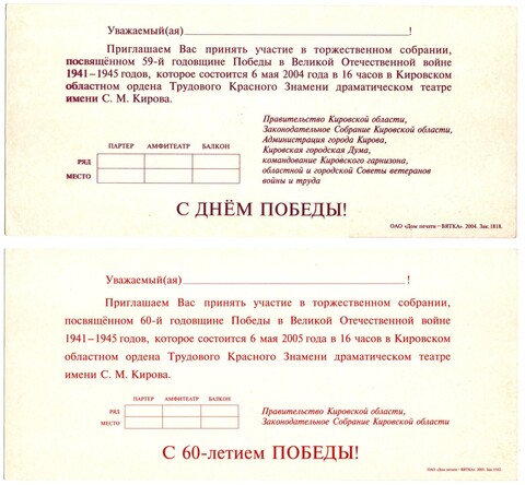 Пригласительный на День Победы. 59,60-я годовщина. Киров. 2 шт. XF
