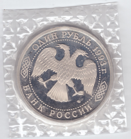 Аверс: Вверху вдоль канта - номинал «Один рубль» и год выпуска «1993 г.», внизу - слова «Банк России». В середине - двуглавый орел, под ним справа - монограмма монетного двора «ЛМД».