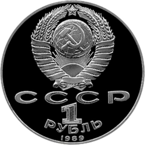 Аверс: сверху - герб СССР с 15 витками ленты, под ним - буквы «СССР», ниже - обозначение достоинства монеты цифра «1» и ниже - слово «Рубль», внизу у канта - год выпуска монеты «1989».
