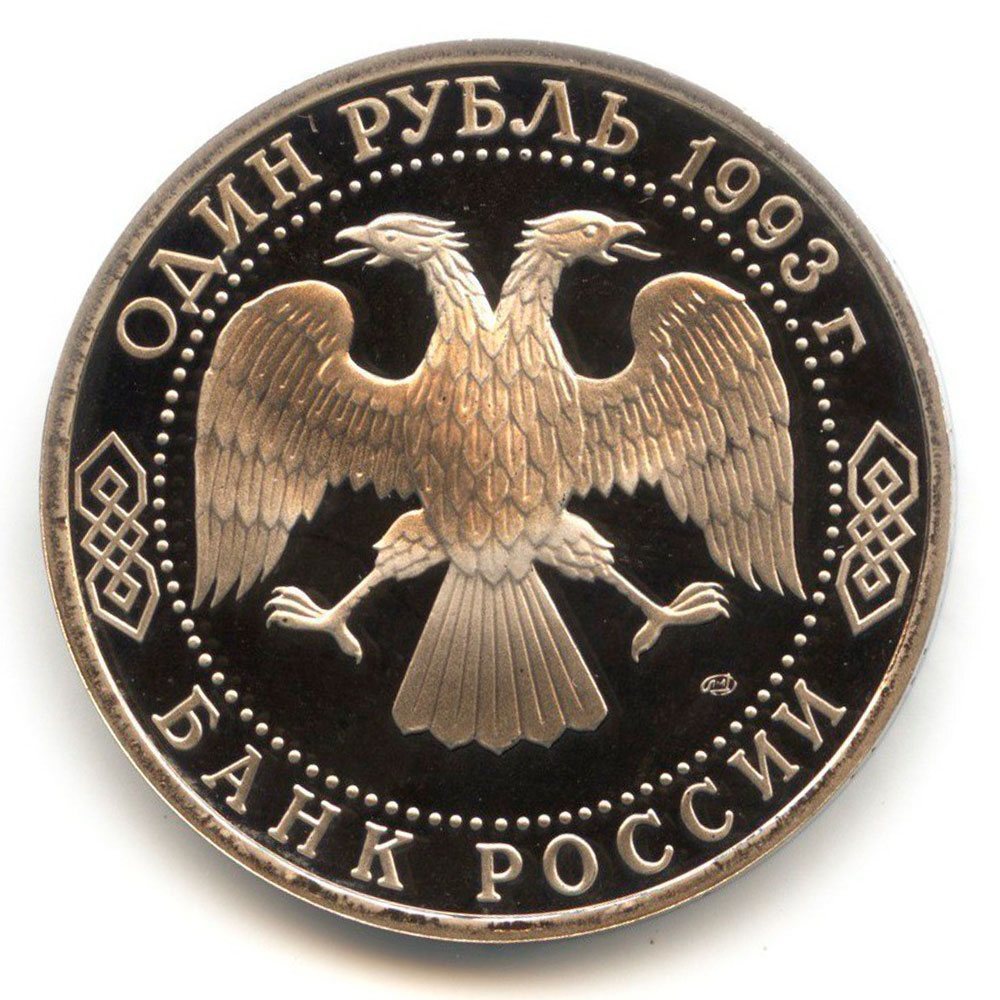 Аверс: вверху вдоль канта номинал «Один рубль» и год выпуска «1993 г.», внизу слова «Банк России». В середине двуглавый орел под ним справа монограмма монетного двора «ЛМД».