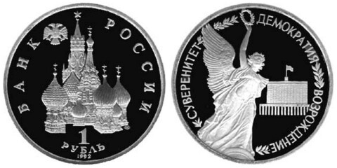Реверс: Скульптурное изображение богини Победы с венком в руке на фоне Дома Советов Российской Федерации в Москве, по окружности - надписи: "Суверенитет", "Демократия", "Возрождение", разделённые лавровыми ветвями.