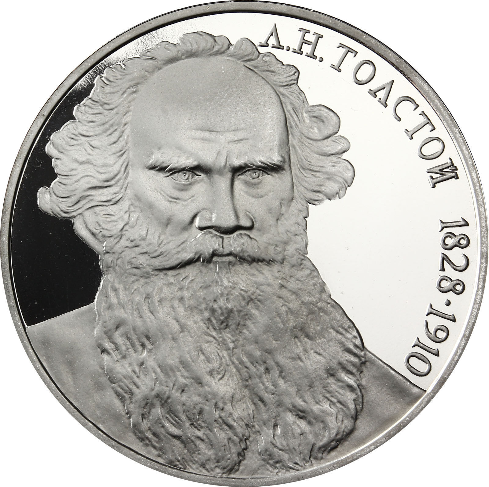 Реверс: чуть левее центра погрудный портрет Л. Н. Толстого. Справа от него вдоль внешнего ободка монеты сверху вниз надпись «Л. Н. ТОЛСТОЙ» и годы жизни писателя «1828 - 1910».