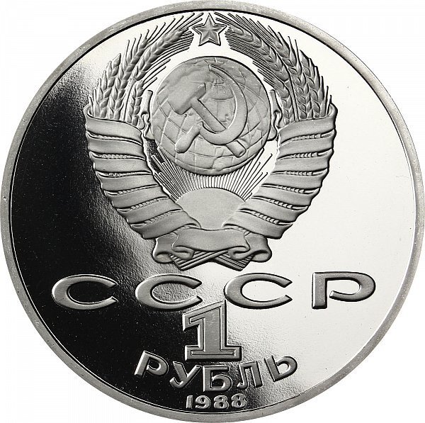 Аверс: сверху герб СССР с 15 витками ленты, под ним буквы «СССР», ниже обозначение достоинства монеты цифра «1» и ниже слово «РУБЛЬ», внизу у канта год выпуска монеты «1988».