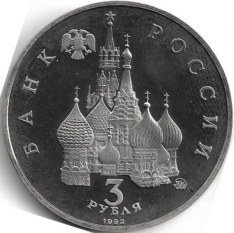 (Proof) 3 рубля 1992 ММД ''Победа демократических сил России 19-21 августа'', следы неправильного хранения