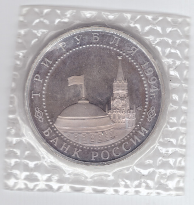 Аверс: Вверху вдоль канта номинал «ТРИ РУБЛЯ» и год выпуска «1994 г.», внизу слова «БАНК РОССИИ». В середине в ободке из точек изображение Спасской башни Московского Кремля и частично перекрывающего ее купола Сенатского дворца с развевающимся флагом, с внутренней стороны точечного ободка справа монограмма монетного двора «ЛМД».