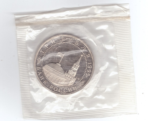 Аверс: Вверху вдоль канта - номинал «Три рубля» и год выпуска «1995 г.», внизу - слова «Банк России». В середине в ободке из точек - изображение Спасской башни Московского Кремля и частично перекрывающего ее купола Сенатского дворца с развевающимся флагом, с внутренней стороны точечного ободка справа - монограмма монетного двора «ЛМД».