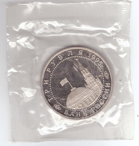 Аверс: Вверху вдоль канта - номинал «Три рубля» и год выпуска «1995 г.», внизу - слова «Банк России». В середине в ободке из точек - изображение Спасской башни Московского Кремля и частично перекрывающего ее купола Сенатского дворца с развевающимся флагом, с внутренней стороны точечного ободка справа - монограмма монетного двора «ЛМД».