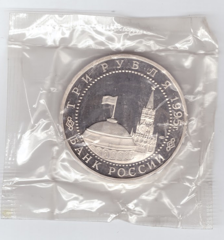 Аверс: Вверху вдоль канта - номинал «Три рубля» и год выпуска «1995 г.», внизу - слова «Банк России». В середине в ободке из точек - изображение Спасской башни Московского Кремля и частично перекрывающего ее купола Сенатского дворца с развевающимся флагом, с внутренней стороны точечного ободка справа - монограмма монетного двора «ЛМД».