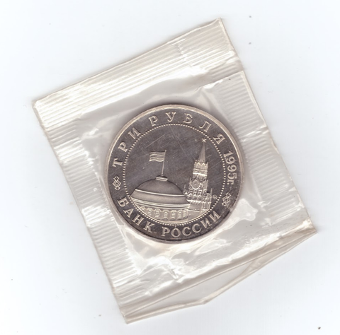 Аверс: Вверху вдоль канта - номинал «Три рубля» и год выпуска «1995 г.», внизу - слова «Банк России». В середине в ободке из точек - изображение Спасской башни Московского Кремля и частично перекрывающего ее купола Сенатского дворца с развевающимся флагом, с внутренней стороны точечного ободка справа - монограмма монетного двора «ММД».