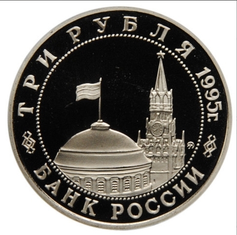 Аверс: Вверху вдоль канта - номинал «Три рубля» и год выпуска «1995 г.», внизу - слова «Банк России». В середине в ободке из точек - изображение Спасской башни Московского Кремля и частично перекрывающего ее купола Сенатского дворца с развевающимся флагом, с внутренней стороны точечного ободка справа - монограмма монетного двора