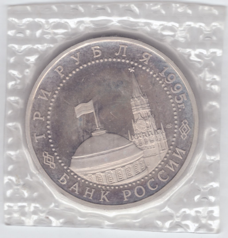 Аверс: Вверху вдоль канта - номинал «Три рубля» и год выпуска «1995 г.», внизу - слова «Банк России». В середине в ободке из точек - изображение Спасской башни Московского Кремля и частично перекрывающего ее купола Сенатского дворца с развевающимся флагом, с внутренней стороны точечного ободка справа - монограмма монетного двора «ММД».