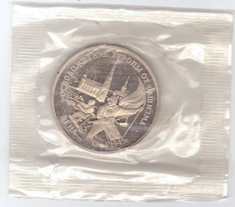 Реверс: Изображения трёх советских солдат во время боя на фоне архитектурных памятников Вены, по окружности надписи, разделённые двумя точками: вверху - "Освобождение Европы от фашизма", внизу -"Вена 13.04.1945 г.". На боковой поверхности монеты - две углублённые надписи "Три рубля", разделённые двумя звёздочками.