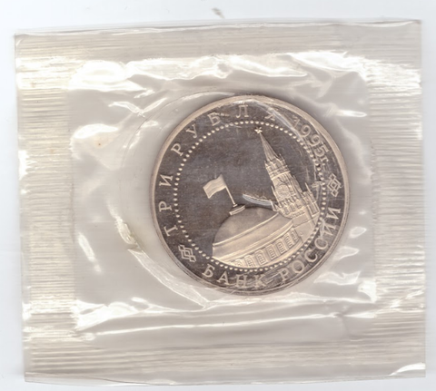 Аверс: Вверху вдоль канта - номинал «Три рубля» и год выпуска «1995 г.», внизу - слова «Банк России». В середине в ободке из точек - изображение Спасской башни Московского Кремля и частично перекрывающего ее купола Сенатского дворца с развевающимся флагом, с внутренней стороны точечного ободка справа - монограмма монетного двора «ЛМД».