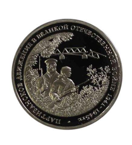 Реверс: Изображения мужчины и женщины с оружием в руках в окружении деревьев, на втором плане - взорванный мост, по окружности - надпись: "Партизанское движение в Великой Отечественной Войне 1941-1945 гг.".