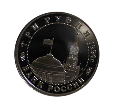 Аверс: Вверху вдоль канта - номинал «Три рубля» и год выпуска «1994 г.», внизу - слова «Банк России». В середине в ободке из точек - изображение Спасской башни Московского Кремля и частично перекрывающего ее купола Сенатского дворца с развевающимся флагом, с внутренней стороны точечного ободка справа монограмма монетного двора «ММД».