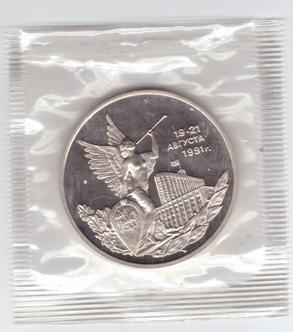 Реверс: Символическое изображение богини Победы на фоне Дома Советов Российской Федерации в Москве, правой рукой опирающейся на щит с изображением герба Москвы, левой рукой держащей горн и попирающей ногой меч; справа от неё - надпись в три строки: "19-21 августа", в нижней части слева и справа от изображения - дубовая и лавровая ветви.
