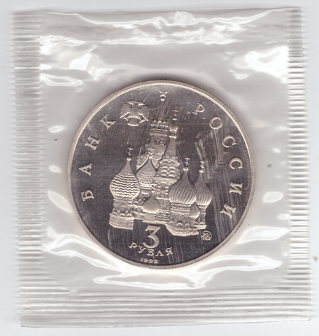 Аверс: Сверху вслева - небольшое изображение двухглавого орла, слева - слово «Банк», справа - «России», внизу - обозначение достоинства монеты - цифра «3», под ним - слово «рубля», ниже - год выпуска монеты «1992», в середине - Собор Покрова Пресвятой Богородицы (собор Василия Блаженного) и за ним Спасская башня Московского Кремля, чуть ниже и правее - монограмма монетного двора «ММД».