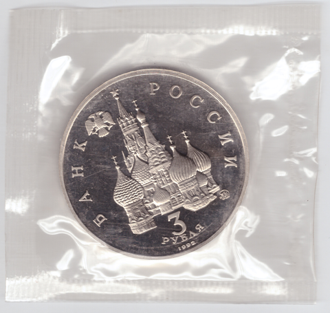 Аверс: Сверху вслева - небольшое изображение двухглавого орла, слева - слово «Банк», справа - «России», внизу - обозначение достоинства монеты - цифра «3», под ним - слово «рубля», ниже - год выпуска монеты «1992», в середине - Собор Покрова Пресвятой Богородицы (собор Василия Блаженного) и за ним Спасская башня Московского Кремля, чуть ниже и правее - монограмма монетного двора «ММД».
