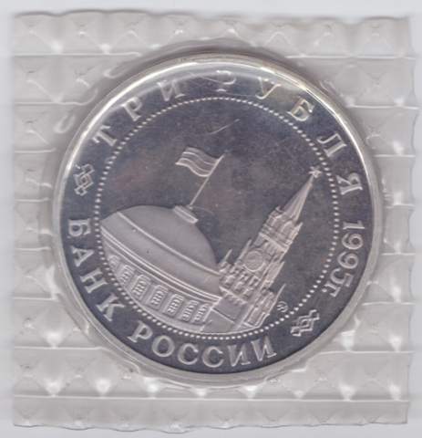 Аверс: Вверху вдоль канта - номинал «Три рубля» и год выпуска «1995 г.», внизу - слова «Банк России». В середине в ободке из точек - изображение Спасской башни Московского Кремля и частично перекрывающего ее купола Сенатского дворца с развевающимся флагом, с внутренней стороны точечного ободка справа - монограмма монетного двора «ММД».