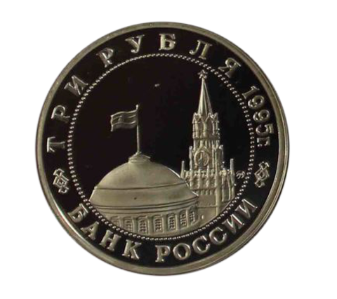 Аверс: Вверху вдоль канта - номинал «Три рубля» и год выпуска «1995 г.», внизу - слова «Банк России». В середине в ободке из точек - изображение Спасской башни Московского Кремля и частично перекрывающего ее купола Сенатского дворца с развевающимся флагом, с внутренней стороны точечного ободка справа - монограмма монетного двора «ММД».