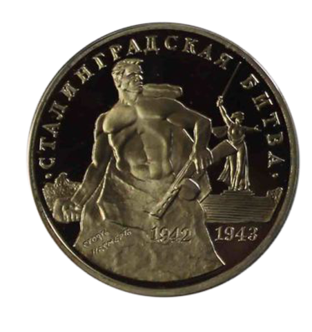 Реверс: Изображения двух скульптур - фрагментов ансамбля - памятника "Героям Сталинградской битвы" на Мамаевом кургане в Волгограде. Вверху по окружности - надпись: "Сталинградская битва, внизу - даты: "1942 - 1943".