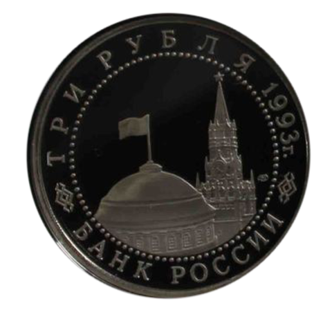 Аверс: Вверху вдоль канта - номинал «Три рубля» и год выпуска «1993 г.», внизу - слова «Банк России». В середине - в ободке из точек изображение Спасской башни Московского Кремля и частично перекрывающего ее купола Сенатского дворца с развевающимся флагом, с внутренней стороны точечного ободка справа - монограмма монетного двора «ММД».