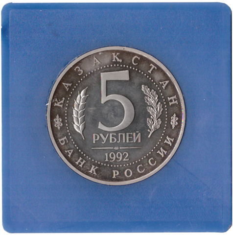 Аверс: в центре диска - надпись в две строки: "5 Рублей", слева и справа от неё - лавровая и дубовая ветви, под словом "Рублей", в центре прерывистой линии - товарный знак монетного двора, ниже - дата "1992". По окружности - надписи, обрамлённые кругом из точек и разделённые орнаментом: вверху - "Казакстан" (название на казахском языке Республики Казахстан), внизу - "Банк России".