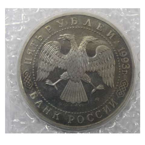 Аверс: Вверху вдоль канта - номинал «Пять рублей» и год выпуска «1993 г.», внизу - слова «Банк России». В середине - двуглавый орел, под ним справа - монограмма монетного двора «ЛМД».